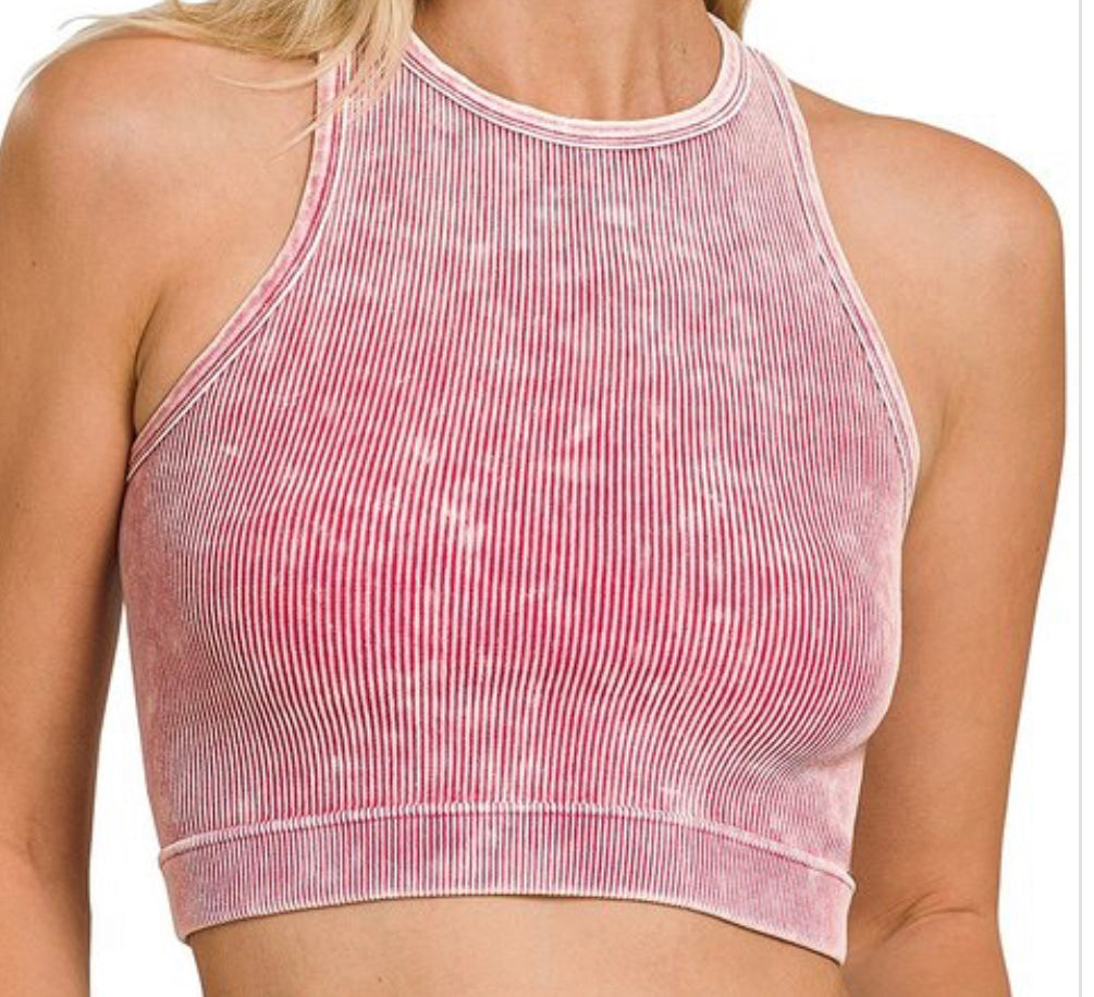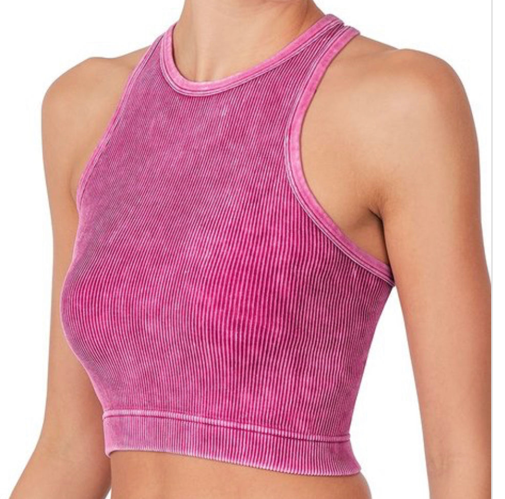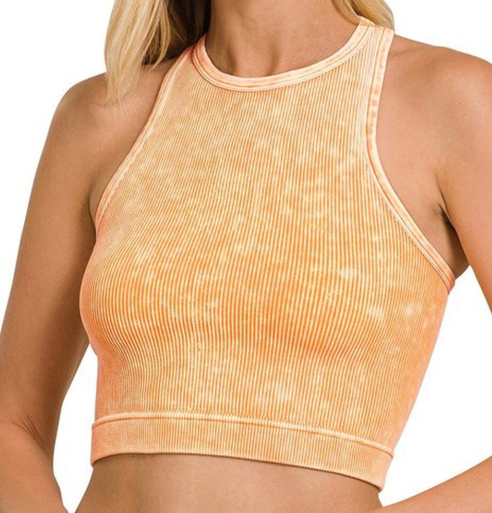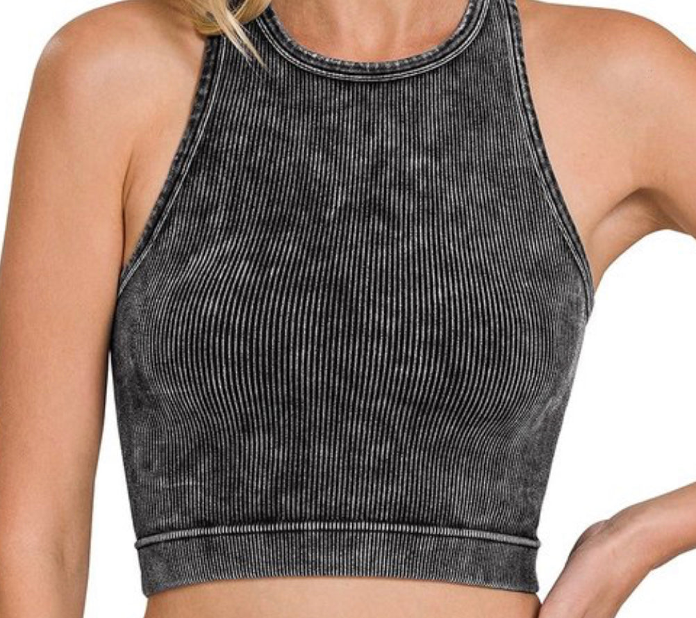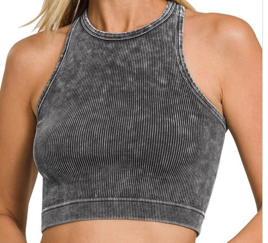 WASHED RIBBED SEAMLESS HIGH-NECK CROPPED TANK TOP