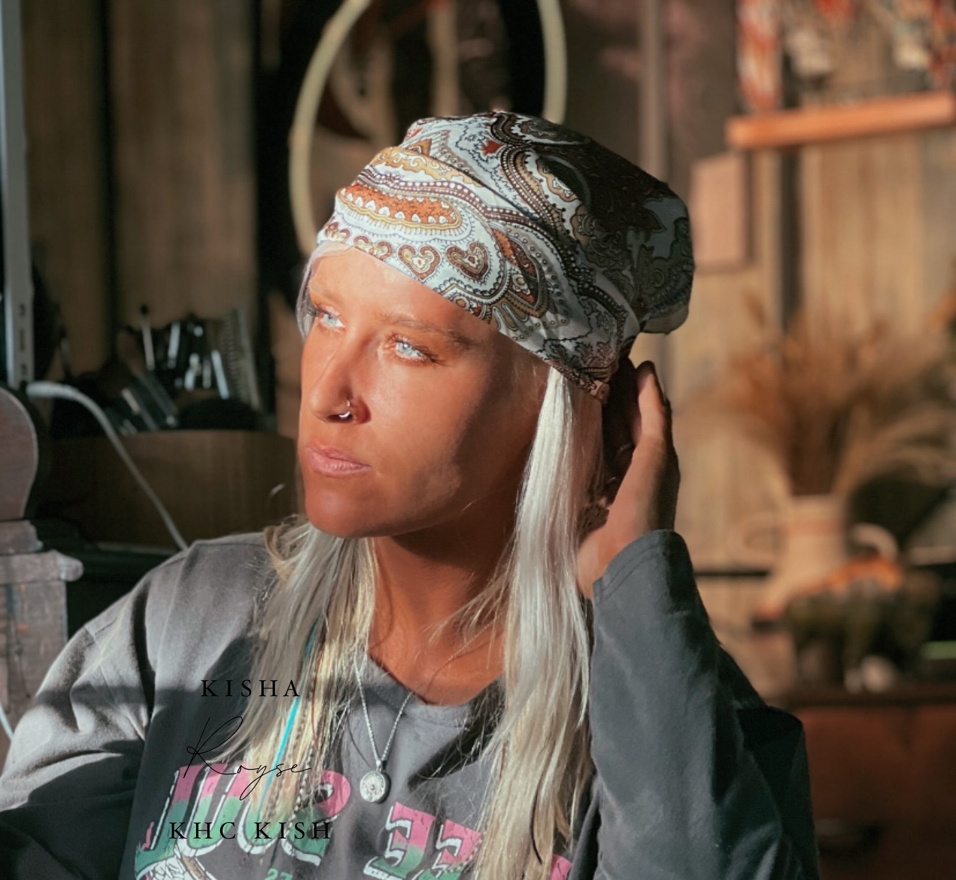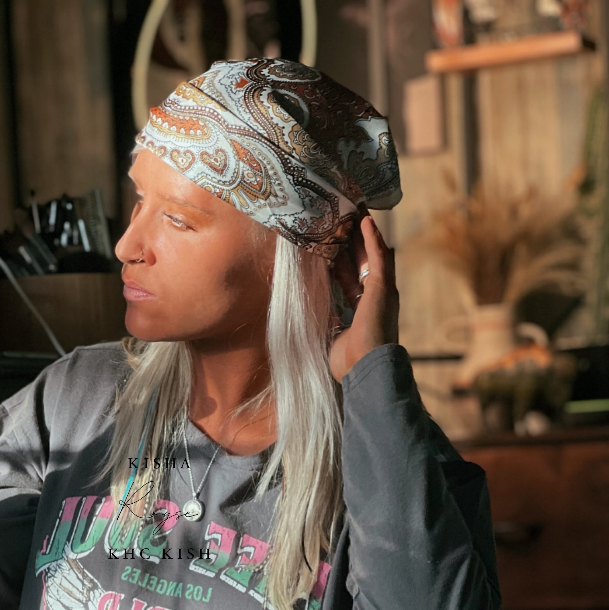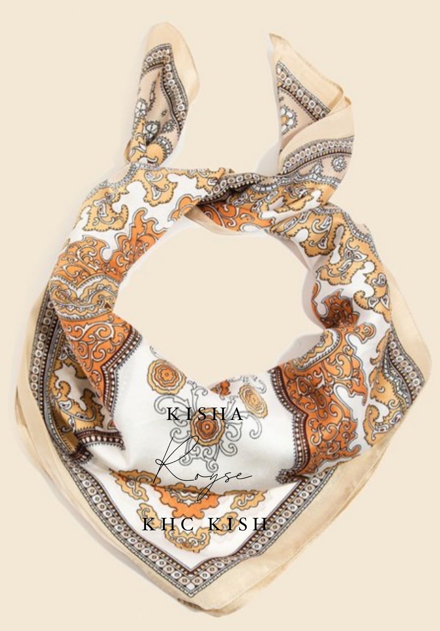 This soon to be trending scarf that has a beautiful ornate floral design square scarf design. Warm shades and this can be used as a hair piece or scarf or even a shirt! Endless ideas and did I mention it’s Silk which is awesome for your hair! This is an absolute must have for any wardrobe.