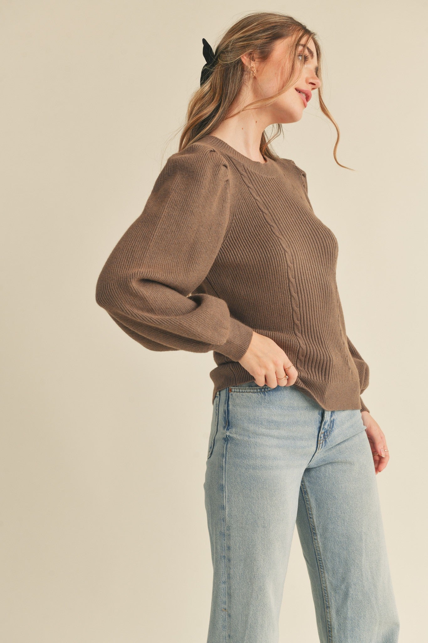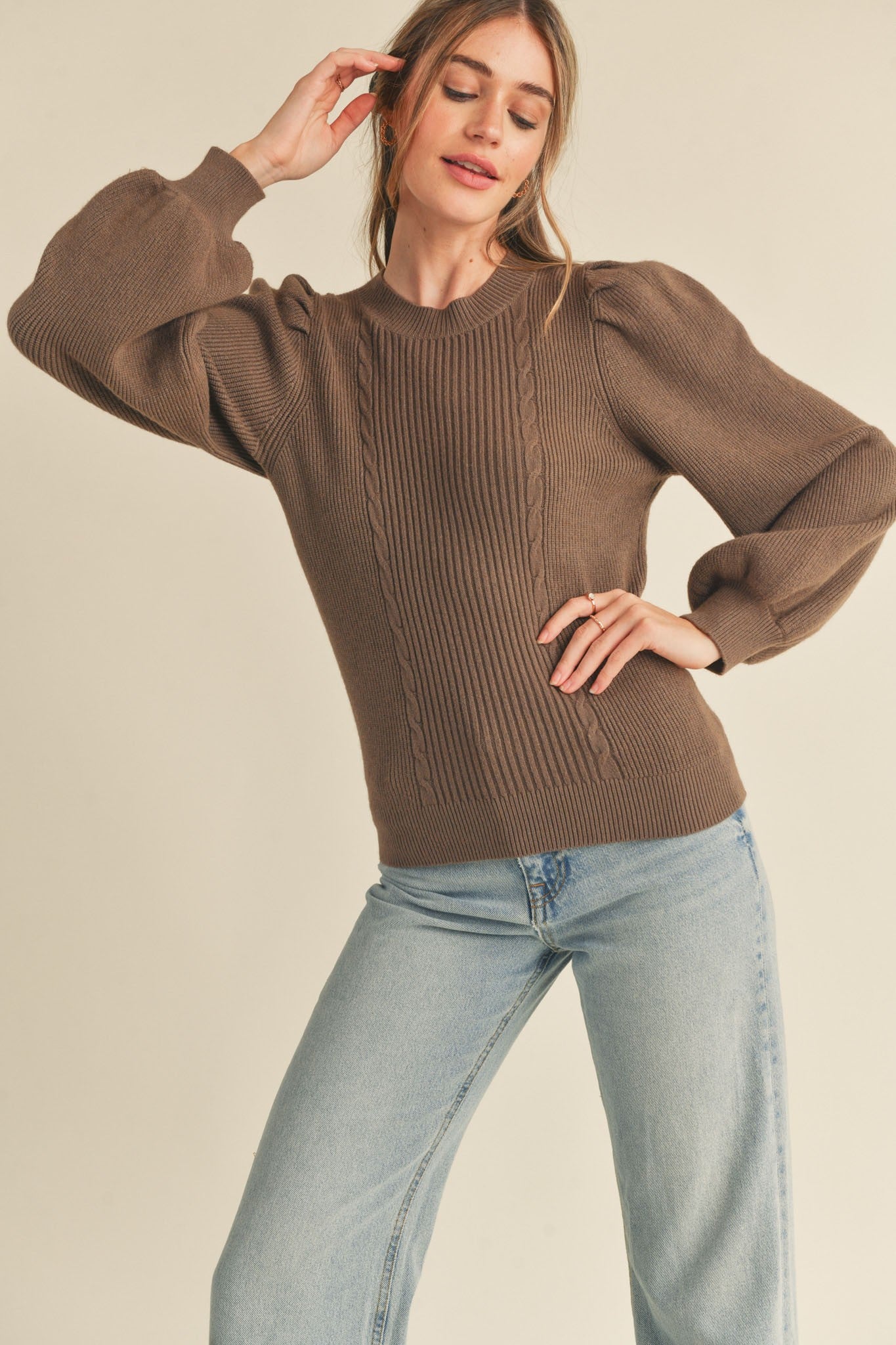 Look your best in this exquisite ribbed puff sleeve sweater. Featuring a ribbed round neckline and gathered puff shoulders, the long puff sleeves with ribbed cuffs and ribbed hem create a classic, yet cozy silhouette. The beautiful cable knit design completes this timeless piece. With a model height of 5' 9.5" and 33-24-36 measurements, this one-of-a-kind sweater is perfect for you!