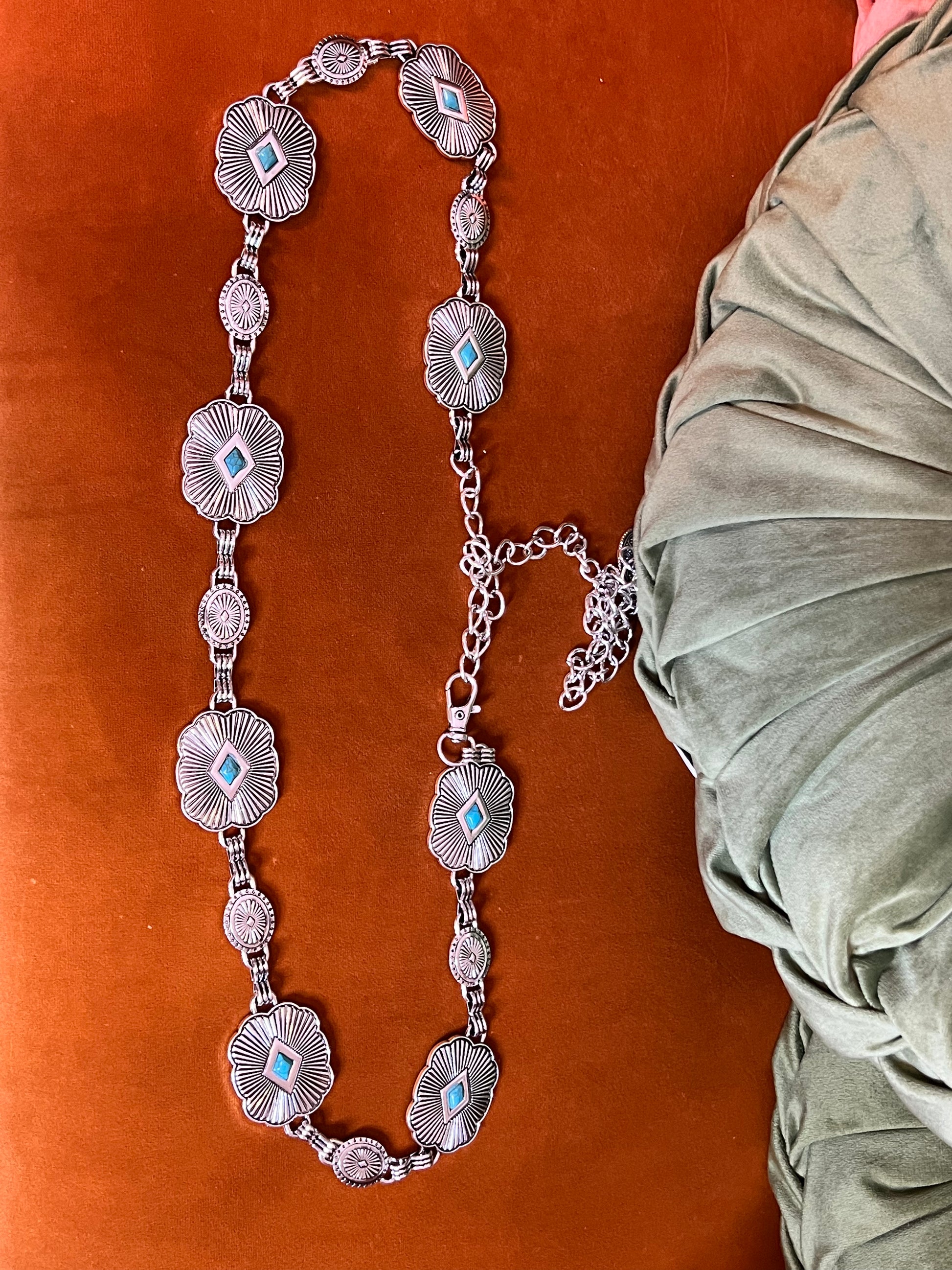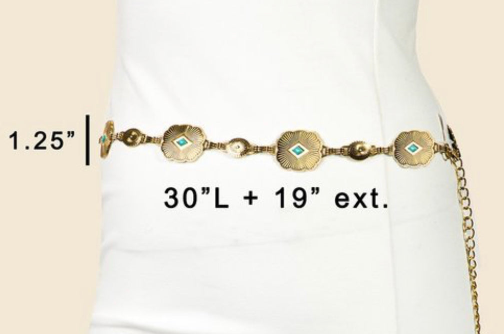 This trendy chain belt features an assorted concho disc design with a length of 30 inches and an extension of 19 inches.