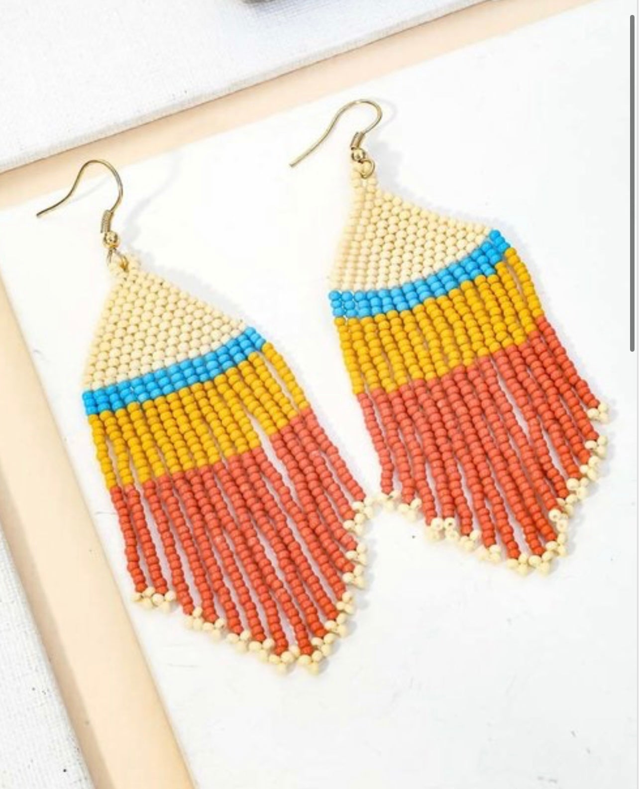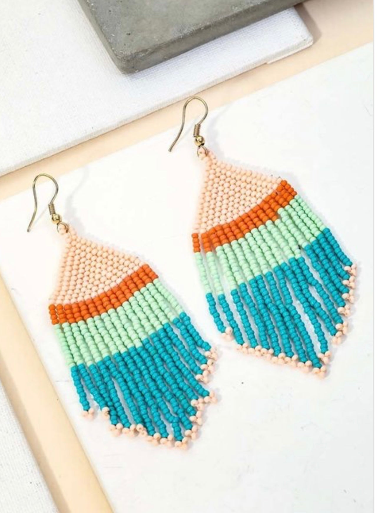 Choose between two pairs or grab both! Both tear dropped beaded earring with one pair in shades of pale pink, coral, pastel mint and turquoise or off white, blue, mustard and coral.