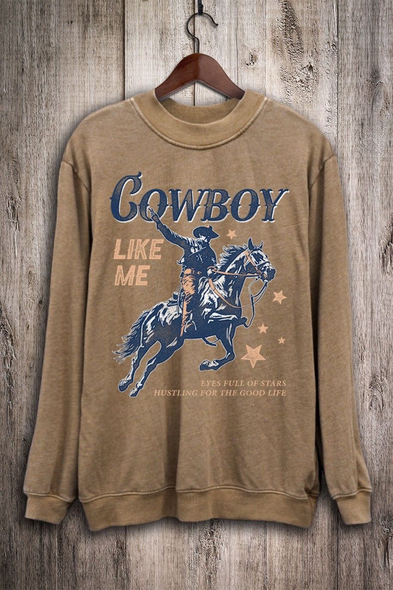 The Cowboy Like Me Graphic sweatshirt is a unique combination of classic style and modern comfort. The taupe shade offers a vintage look, while the fabric blend of cotton and polyester is pre-shrunk to retain shape. With long sleeves and detailed cowboy/horse theme, this piece is perfect for cold waterwash with like colors, and tumble dry on low for maintenance. This unique design is modelled with a size Small (LENGTH: 26" / BUST:46"), and proudly made in America.