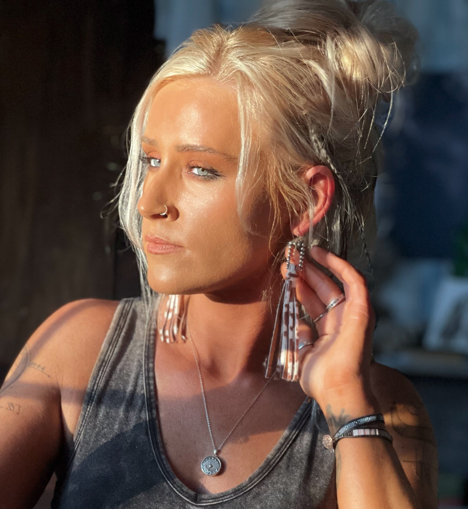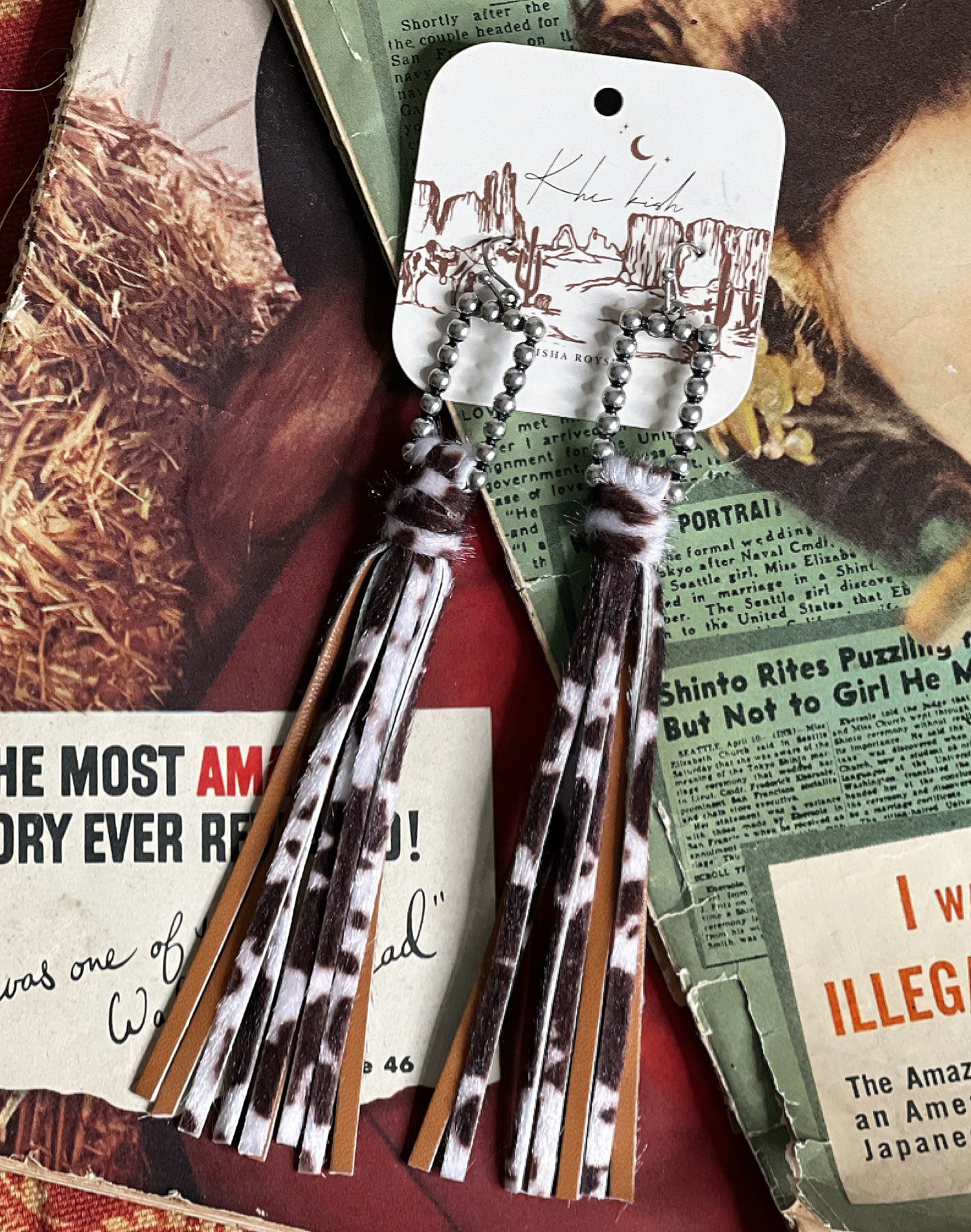 RECTANGULAR BAR CASTING WITH COWHIDE PRINT LEATHER FISH HOOK DANGLING EARRING