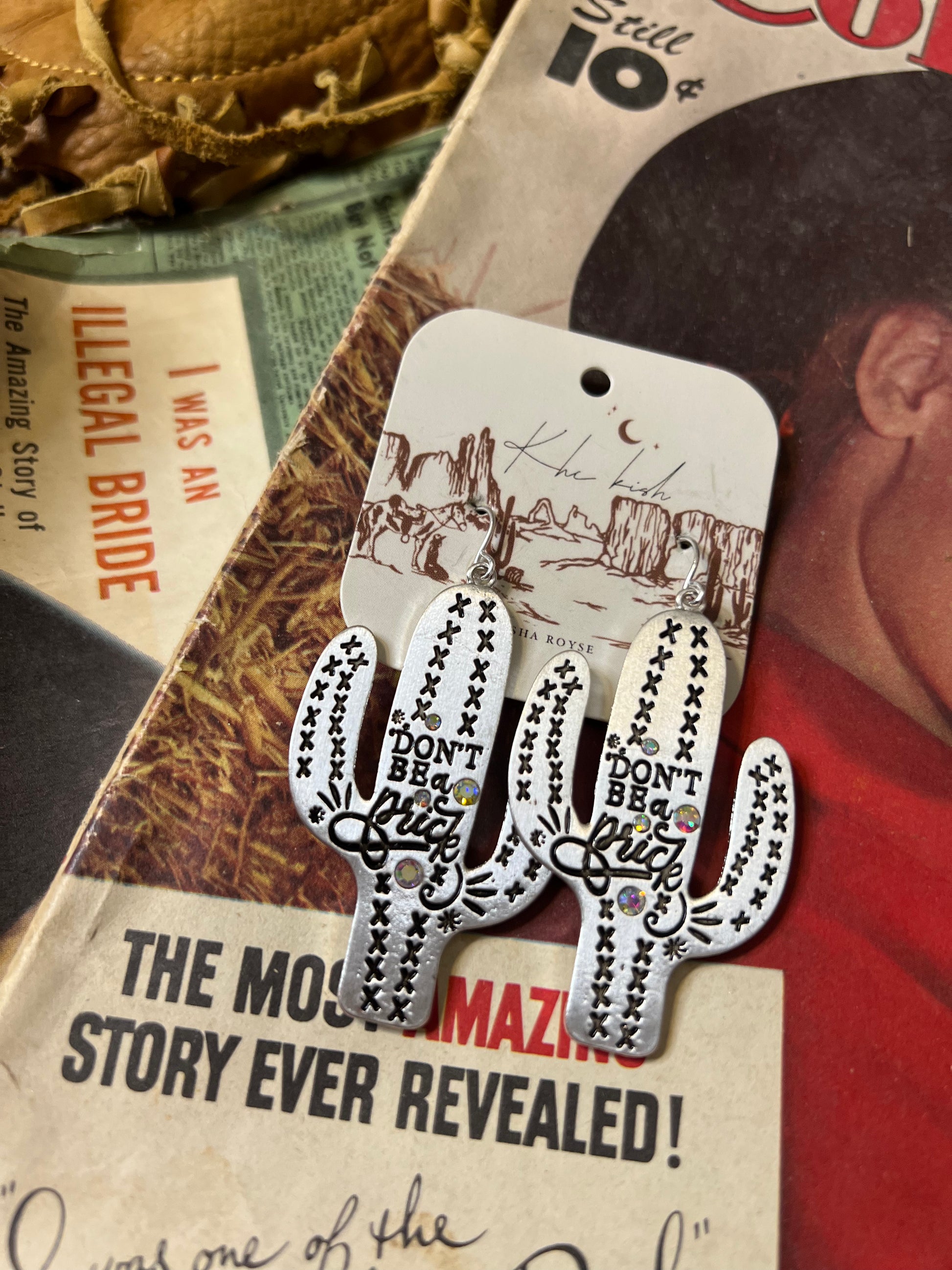 RHINESTONE ACCENT DANGLE AND DROP HOOK EARRINGS “Don’t be a Prick” saying inside of the earring.