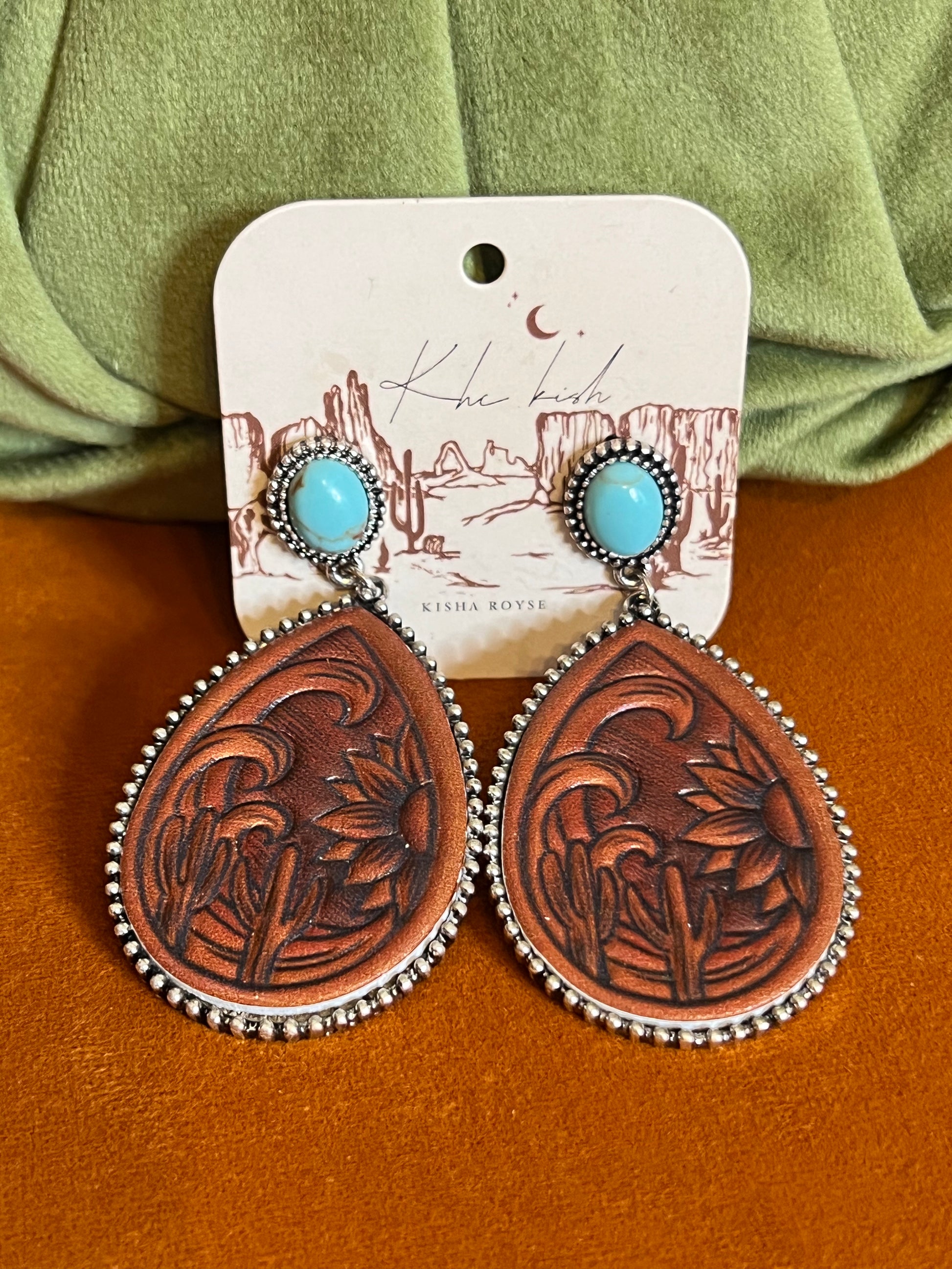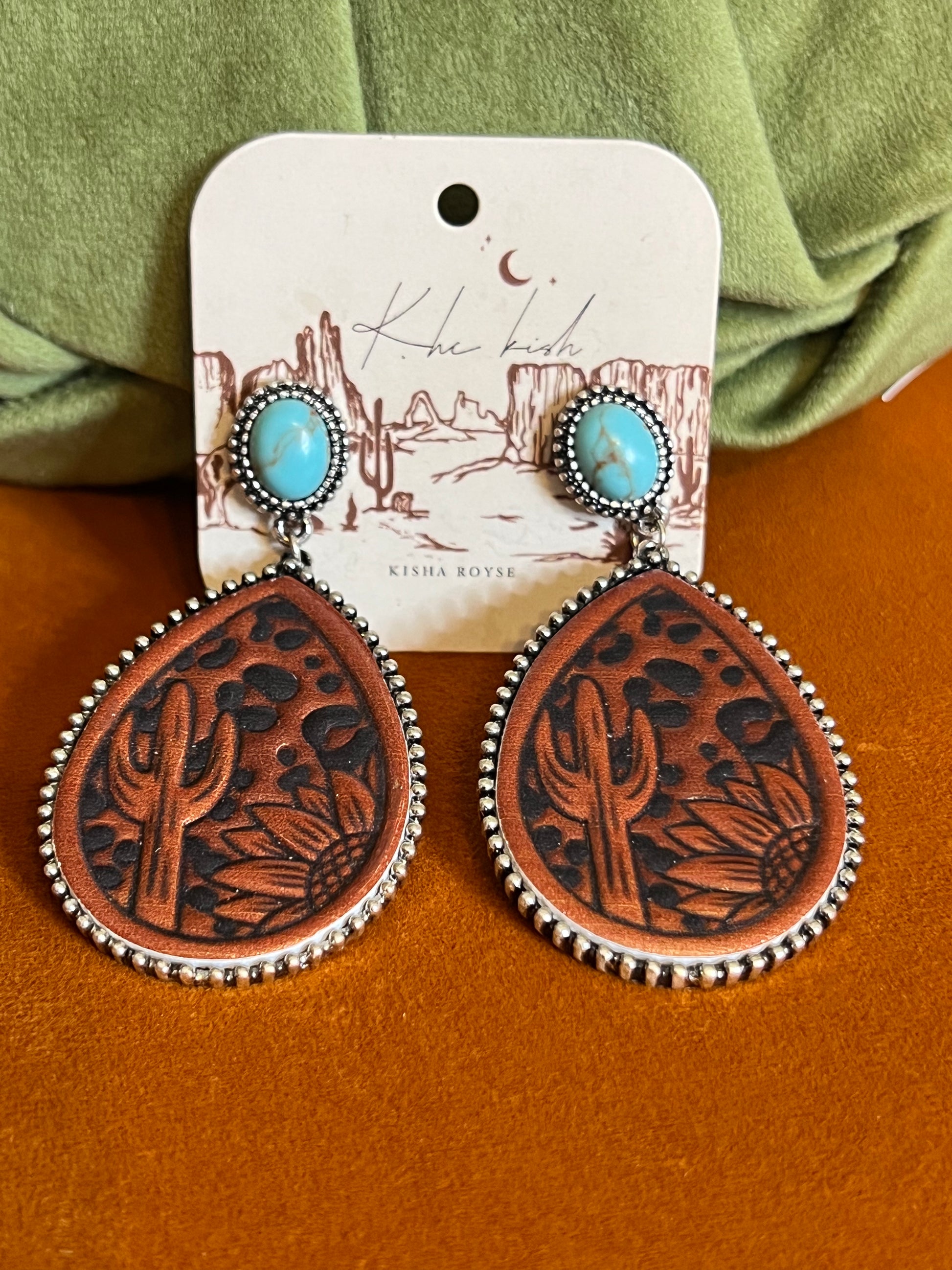 These lightweight leather earrings feature leopard, cactus, and sunflower prints, set with gemstone posts. Perfectly on trend and sure to draw attention.