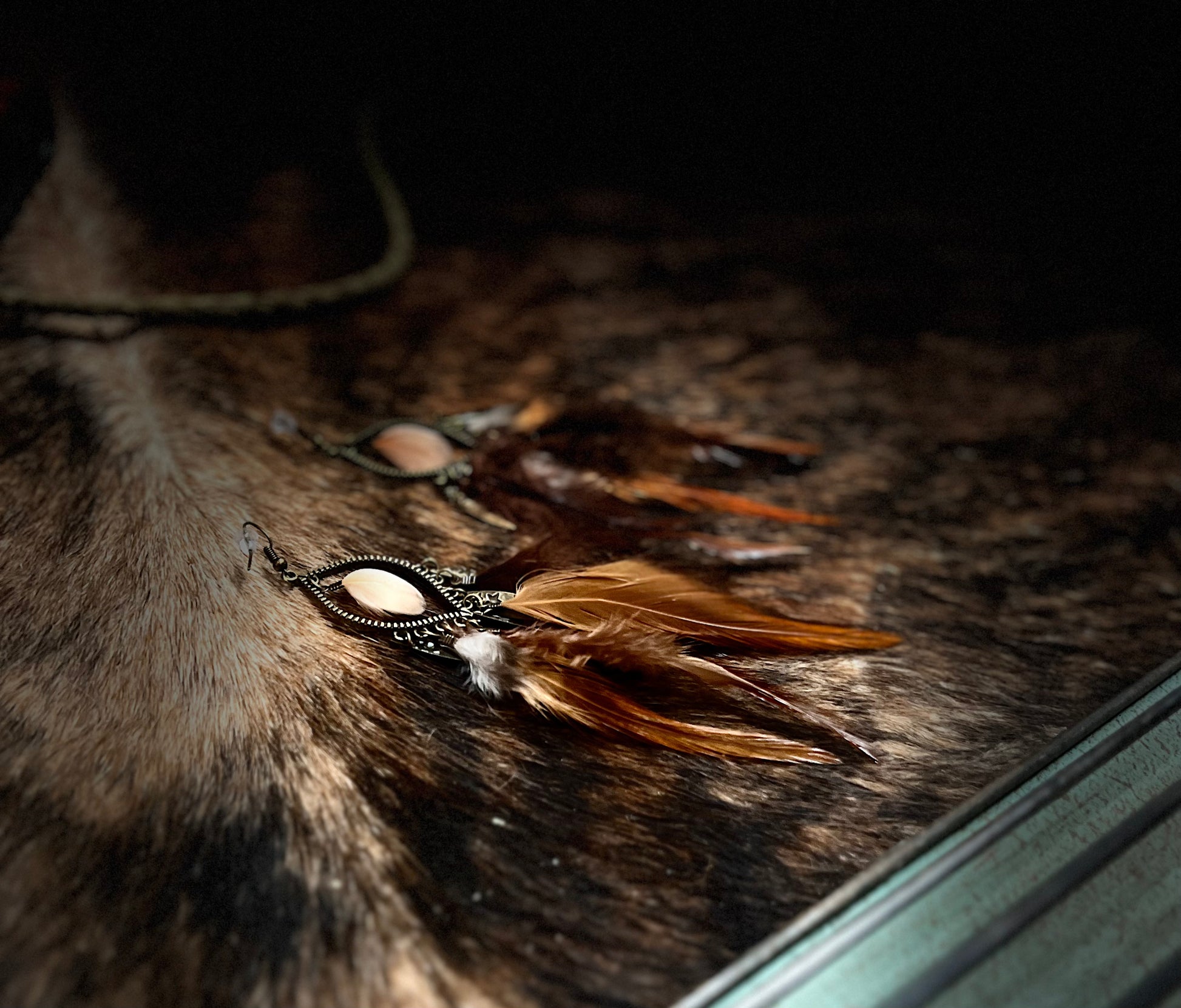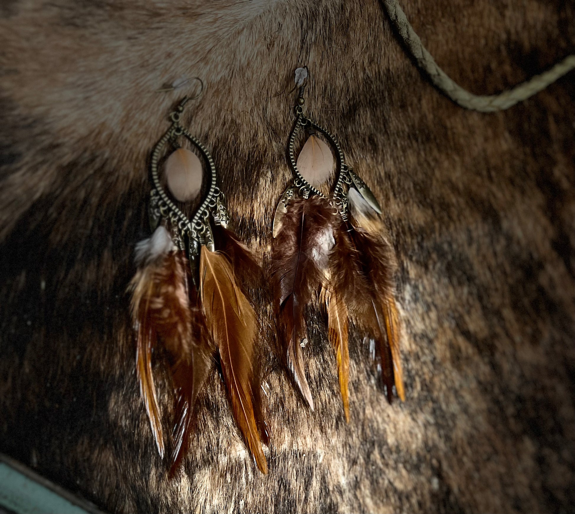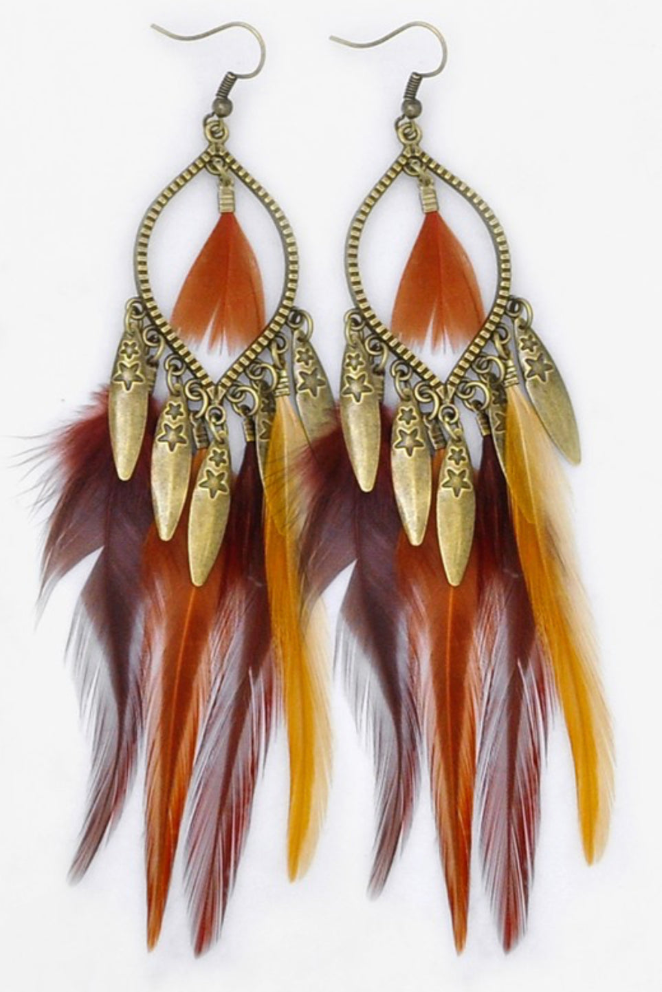 Gorgeous feathered bohemian earrings with shades of orange, brown and brownish red. Plates in between each feather with stars!