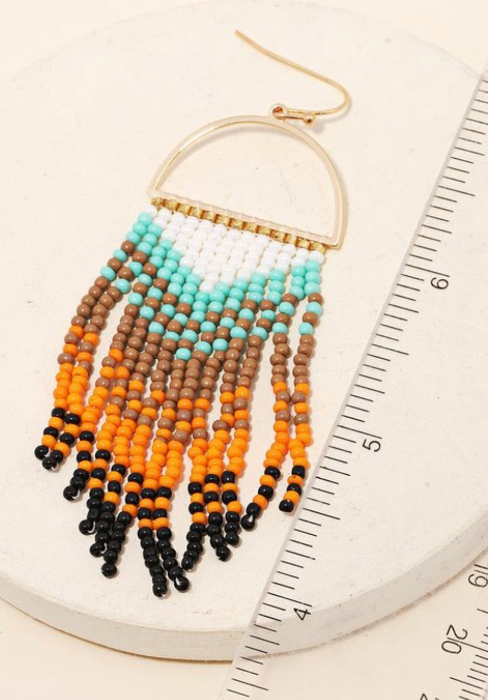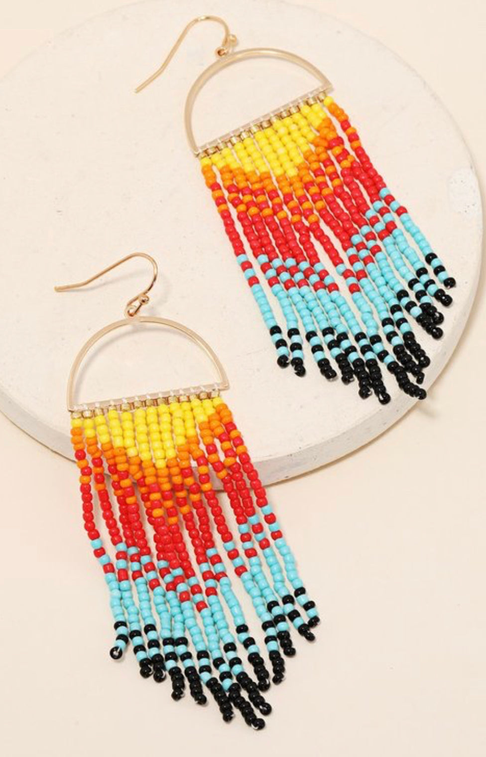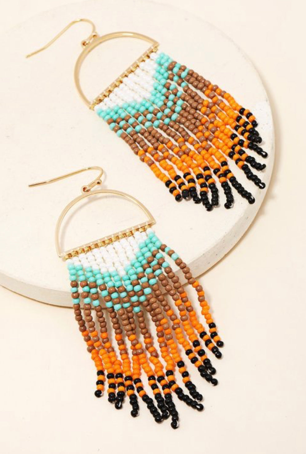 Beautiful unique semi circle multi seed beaded fringe earrings. Perfect for the Spring season