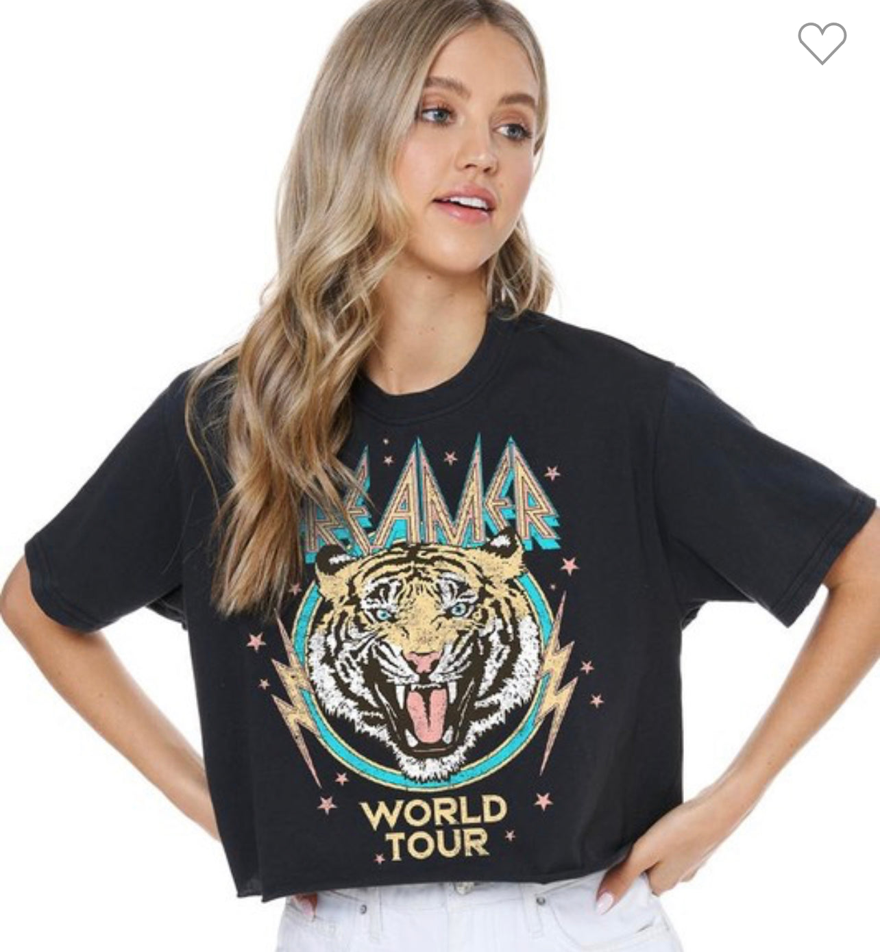 Take your style on a wild ride with this premium cotton crop top. Featuring a relaxed fit, raw hem edge detail, and a dreamer tiger world tour graphic - you'll be ready to take on any challenge!