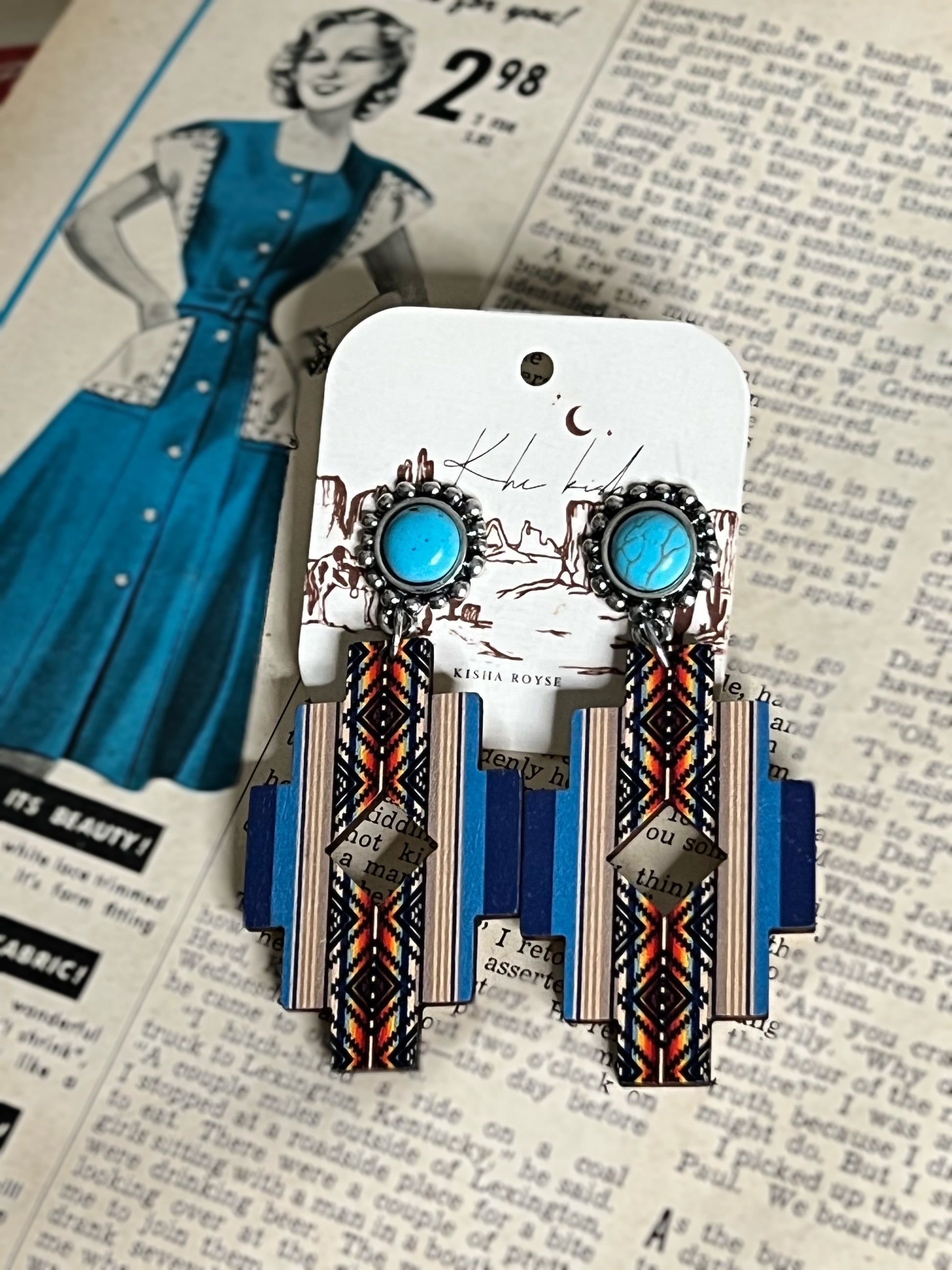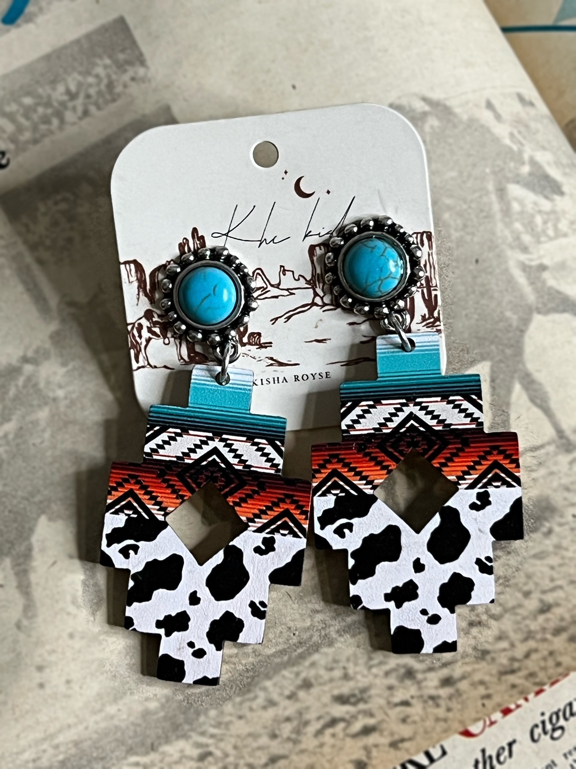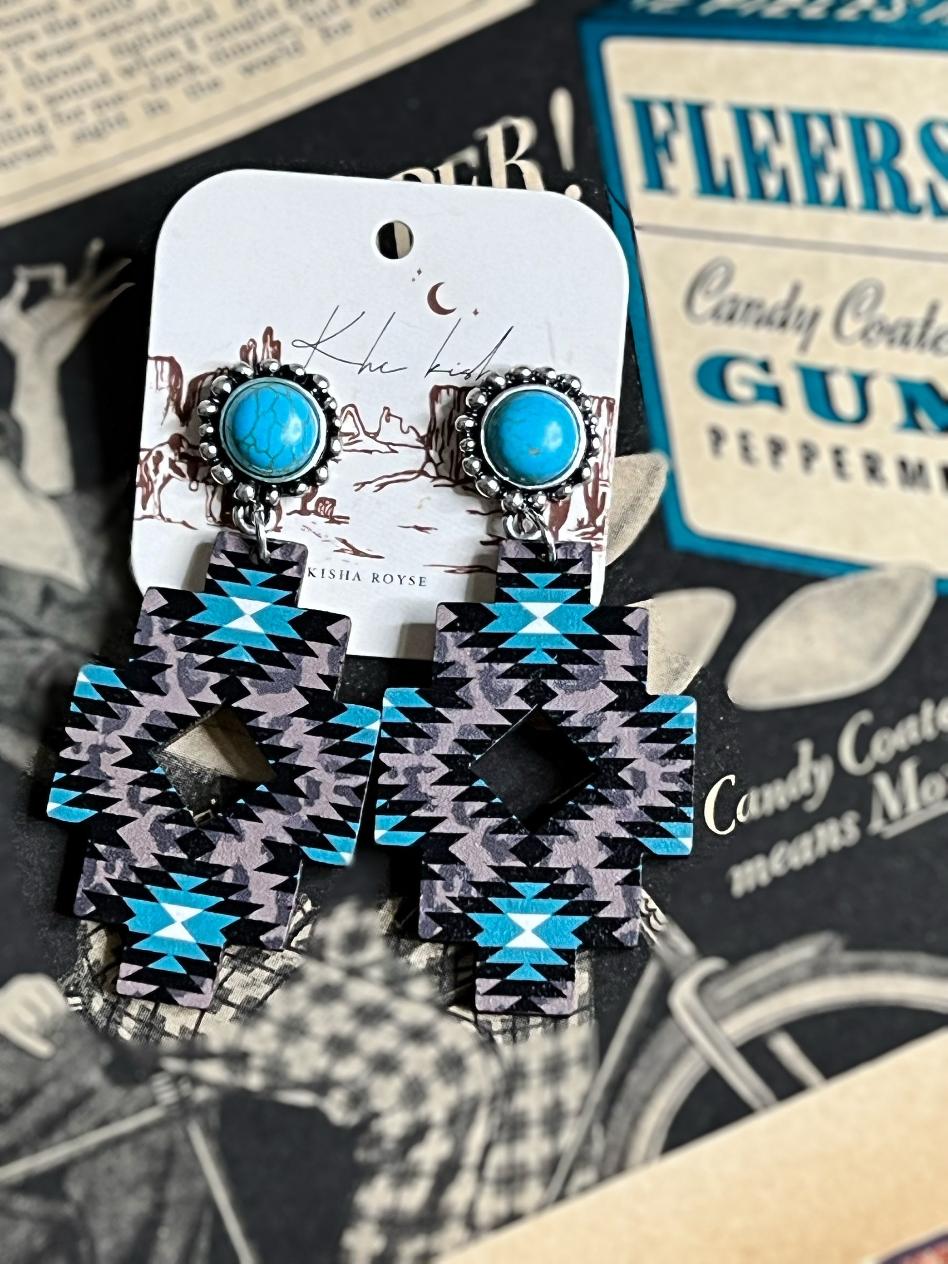 AZTEC PRINTED WOOD POST DANGLING Earring with a Turquoise stone stud!