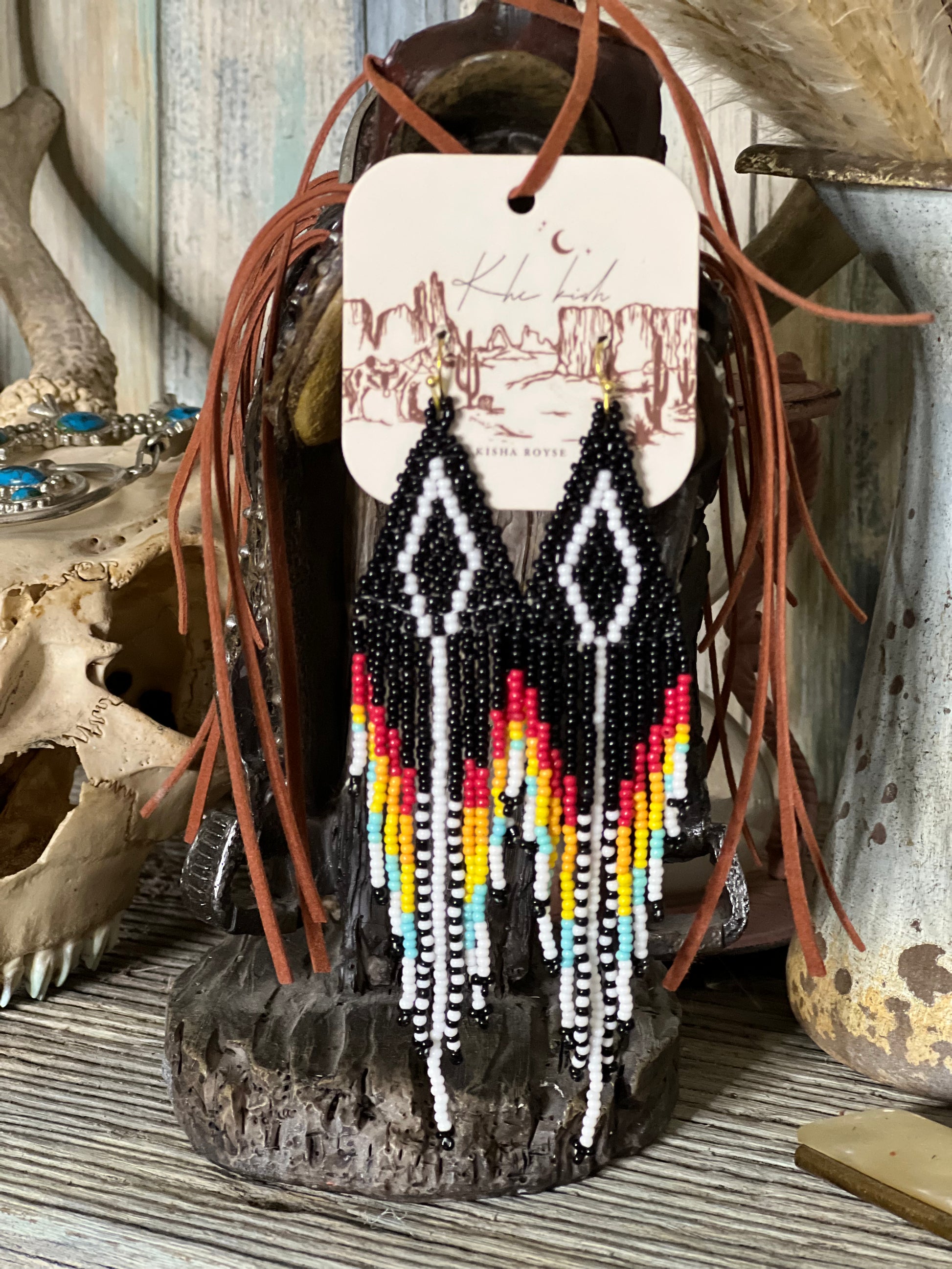 Western Tear drop earrings with shades of coral blue, reds, yellows, black! Perfect piece for a statement jewelry for any outfit!
