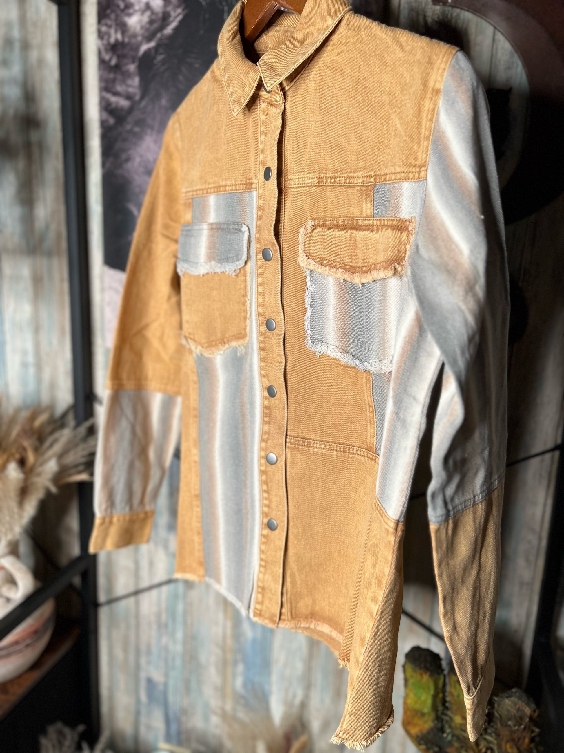Fans of vintage fashion will adore this color-blocked jacket, featuring popular shades of brown, gray, and white. The soft denim-feel fabric has frayed details for an authentic look. Take care of your garment with cold water washes and air-drying; it's made of 100% cotton.