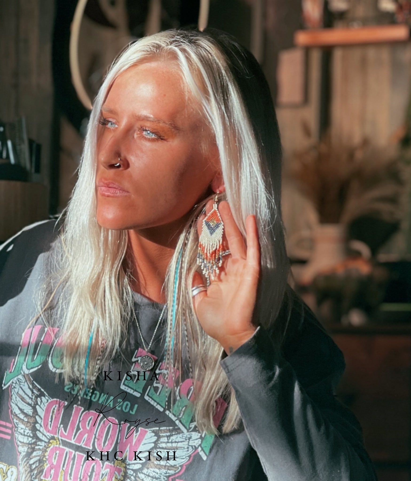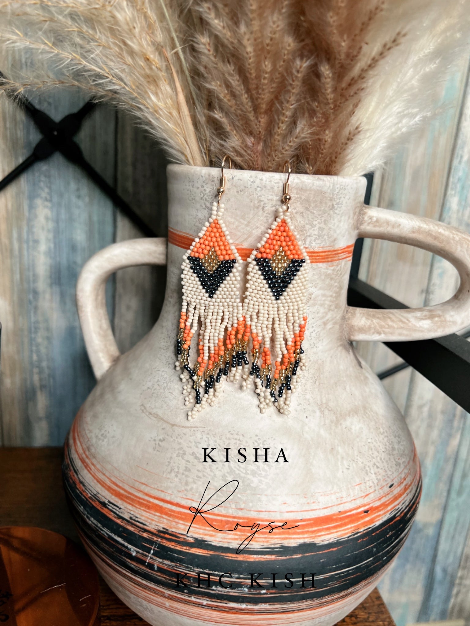 These gorgeous and absolute must have pair of drop earrings that features a gorgeous seed beaded with shades of Cream, Orange and Blue in a style of fringe drop earrings. A beautiful gift for a loved one!