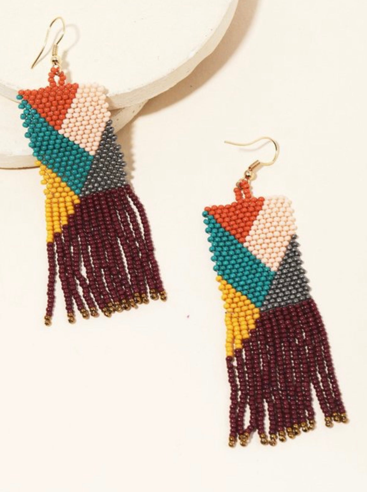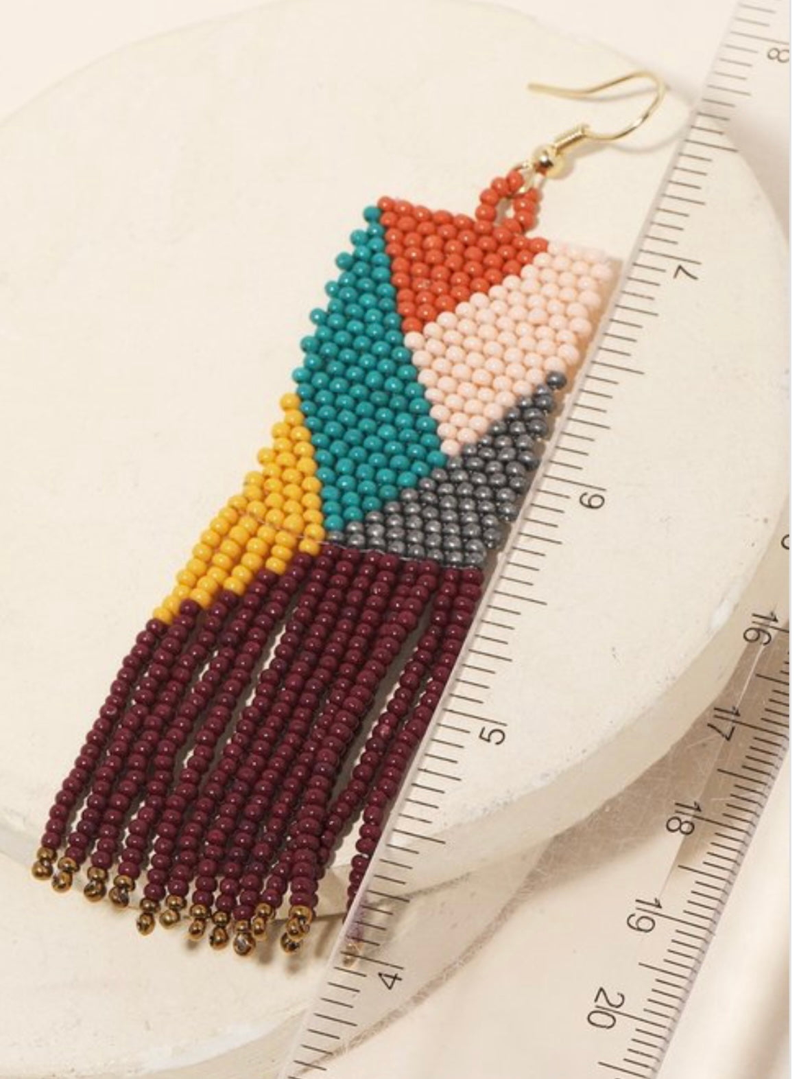 Fish Hook drop down earring with color block patterns of pale pink, mauve orange, mustard, gray, turquoise and wine shades!