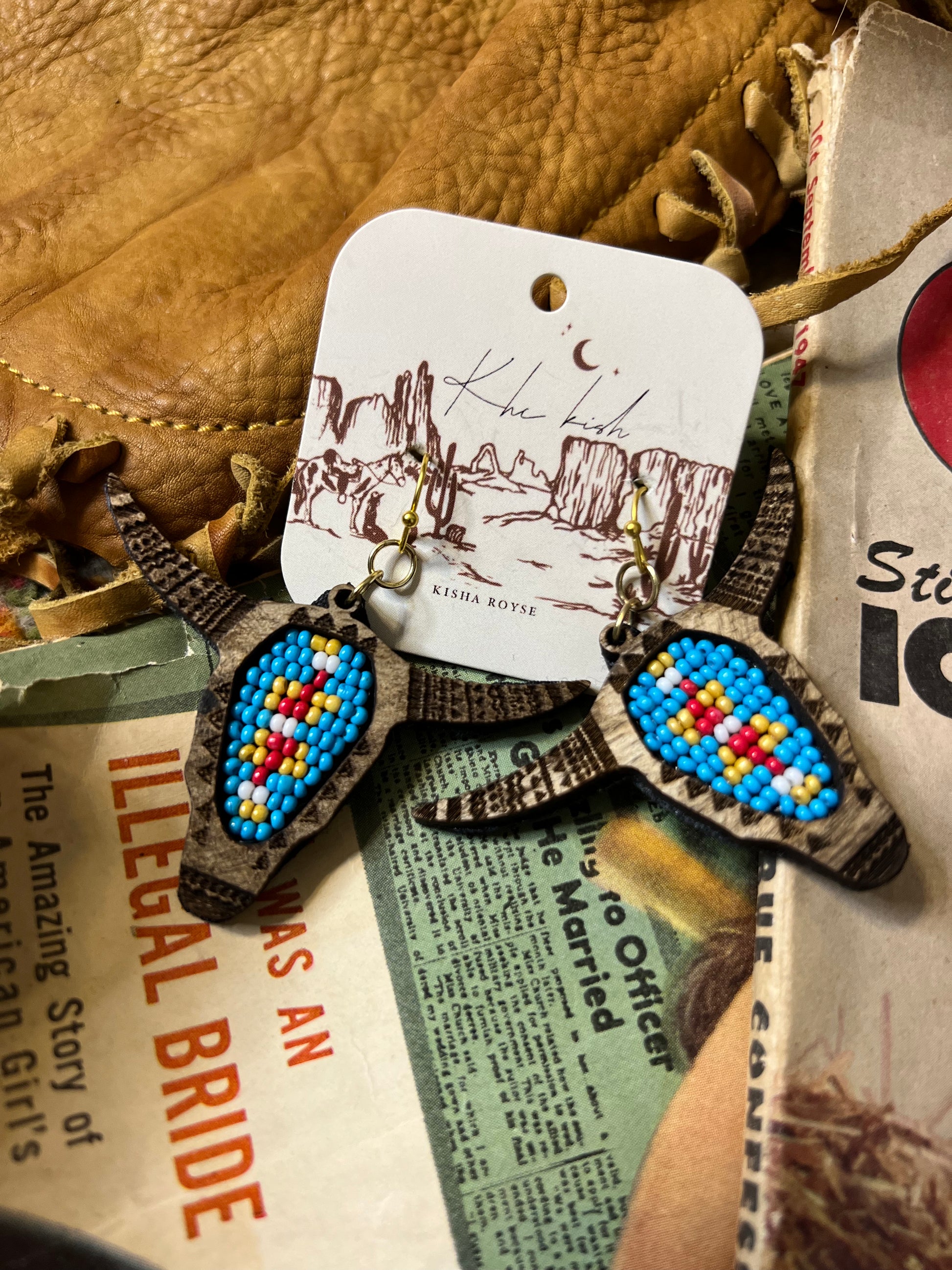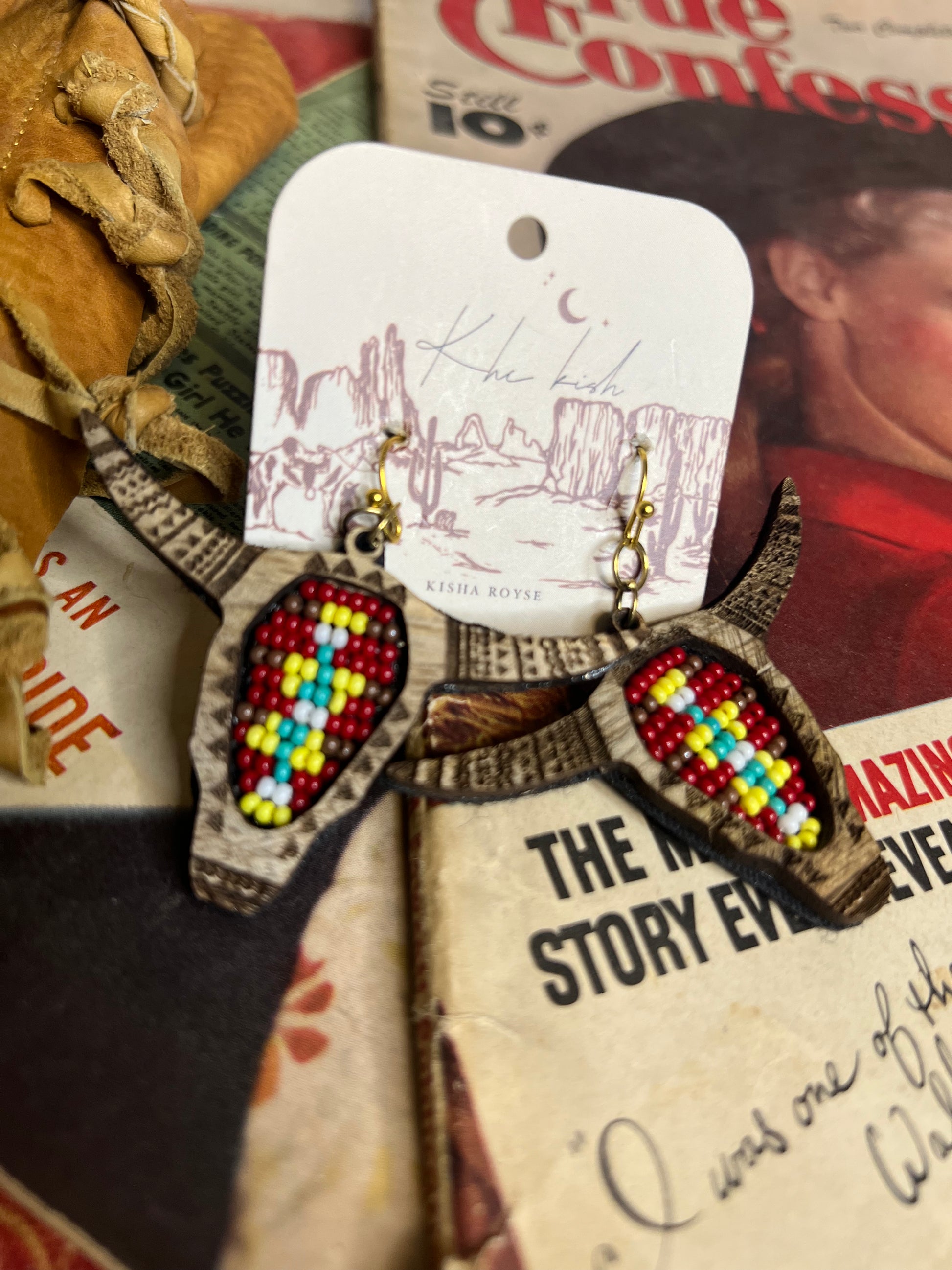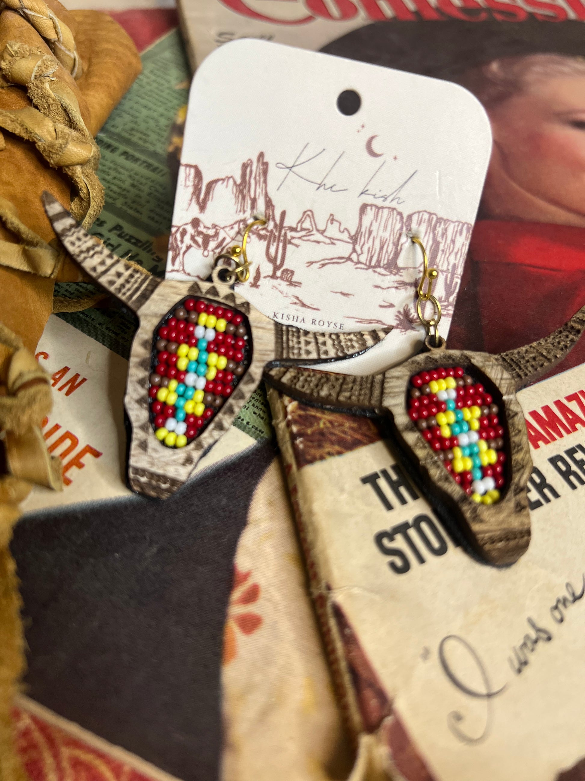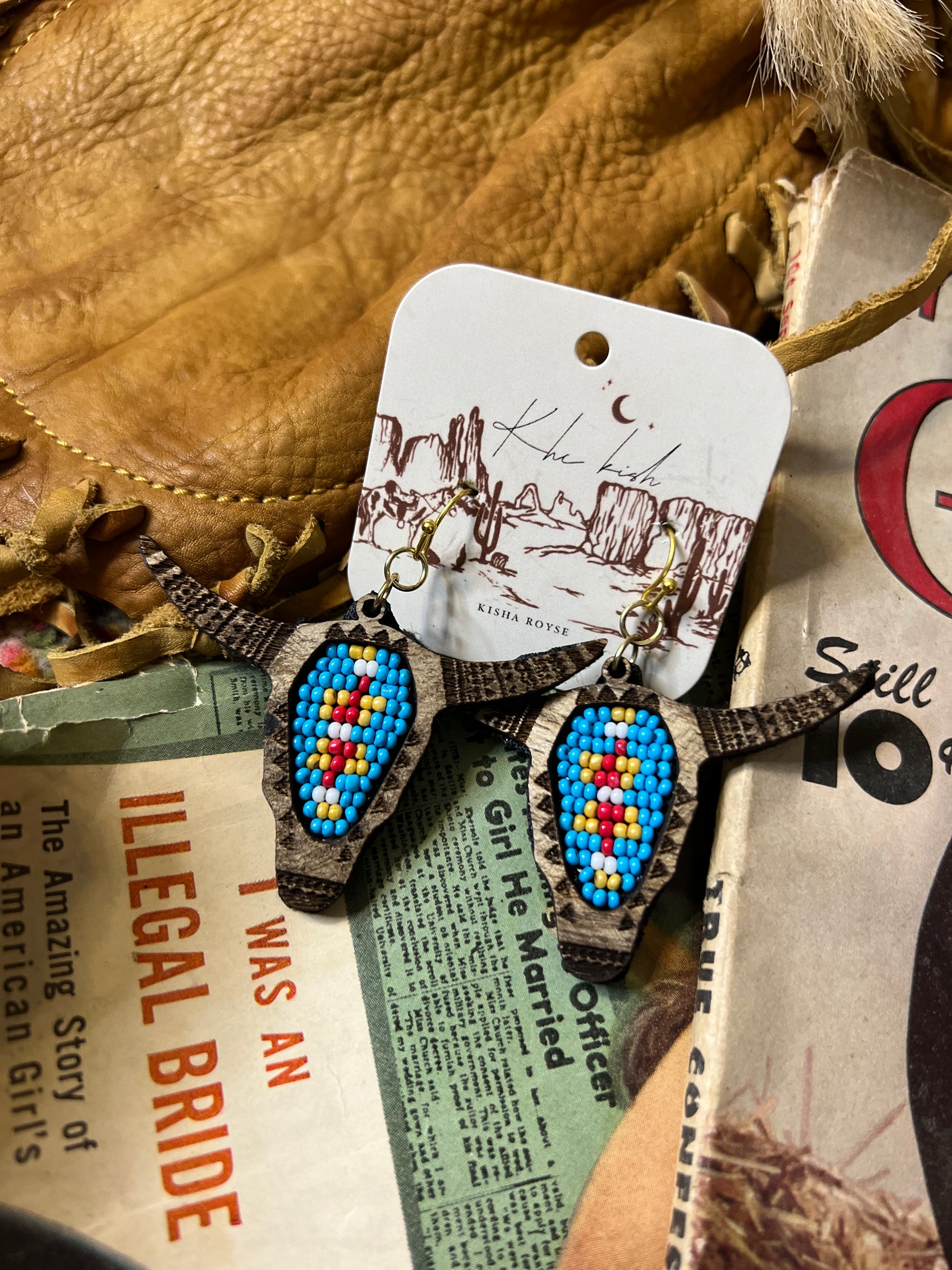 These Skull Western Bead Earrings are visually striking, with an Aztec print that catches the eye. The lightweight construction ensures comfortable wear, while the Longhorn Wood Fish Hook Dangling Earring adds a unique touch.