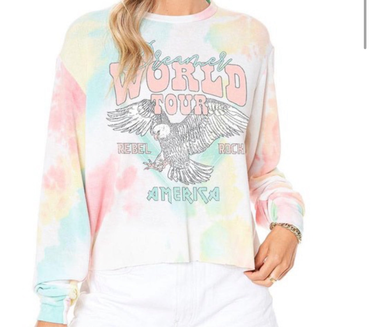 Take a trip in this DREAMER WORLD TOUR AMERICA GRAPHIC TIE DYE Top! Super comfy French Terry and Spandex blend fabric, sourced from the USA. Set sail in style!