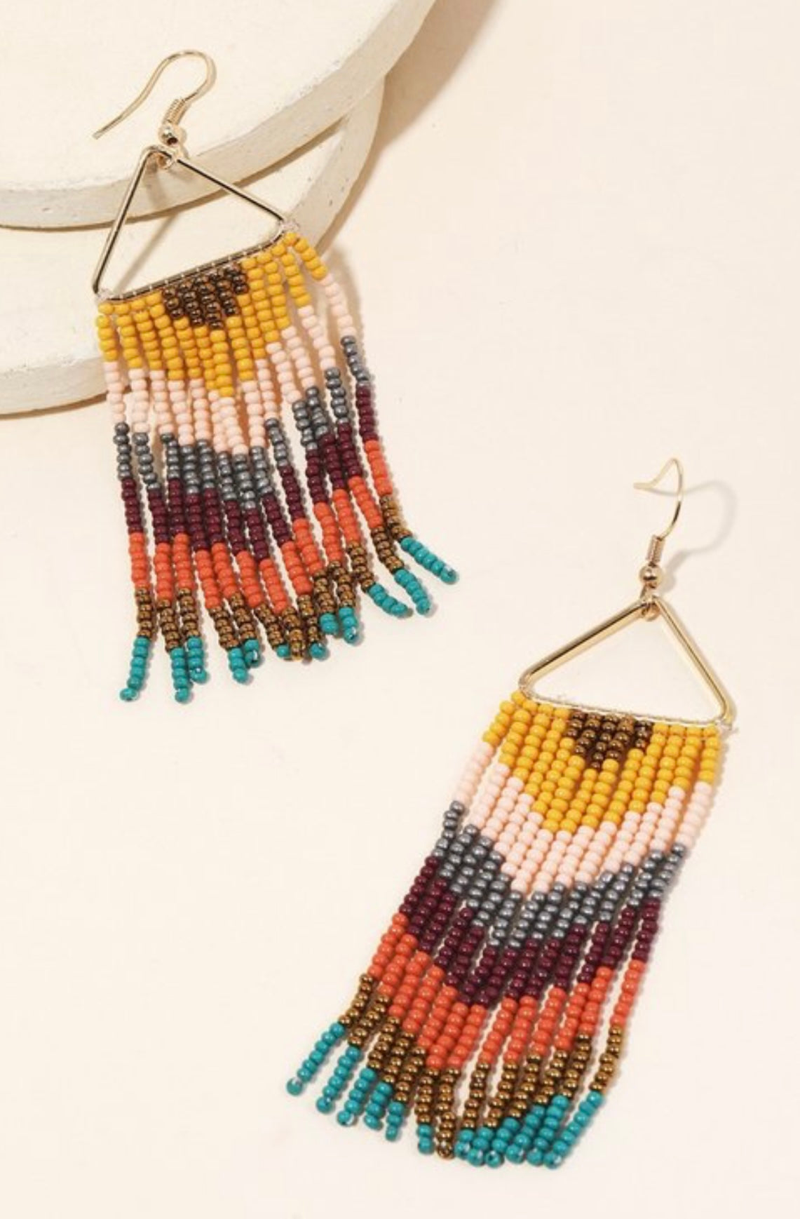 Triangle drop down beaded earring with shades of mustard, pale pink, gray, coral, gold and turquoise!