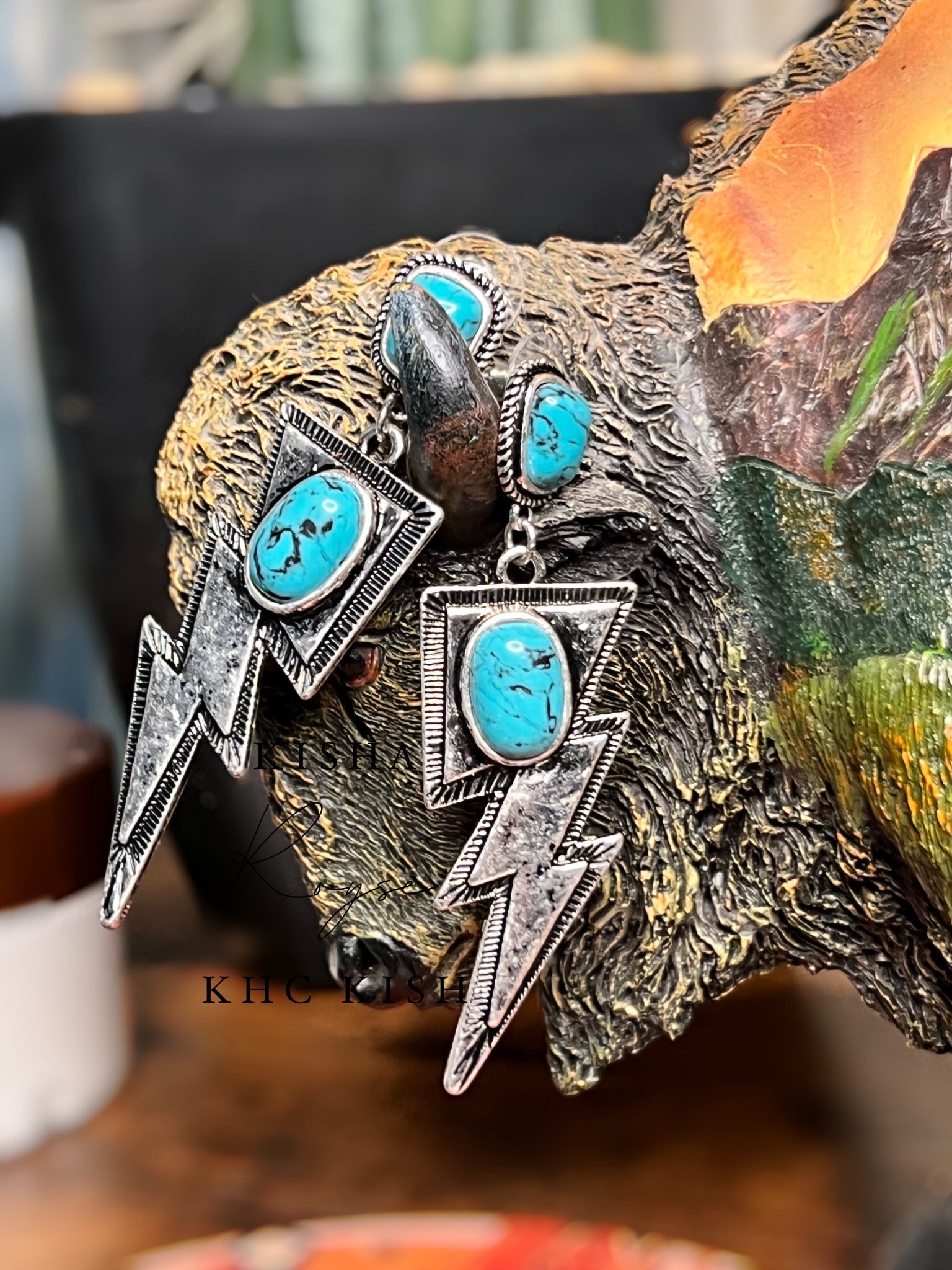 THUNDER BOLT CASTING WITH Turquoise GEMSTONE POST DANGLING EARRING!