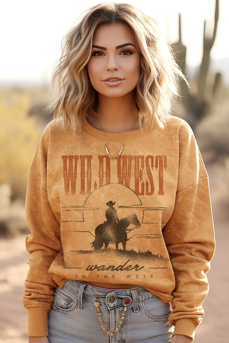 Cozy up in this vintage-inspired mustard-hued Wander in the West Graphic Sweatshirt! Soft to the touch and pre-shrunk, this cold-water-only-washed piece features long sleeves, lies easy on the eyes, and is made with cotton-poly blend fabric for extra warmth. Model is wearing a size Small (LENGTH: 26" / BUST: 46"), and we've proudly crafted it in the USA!
