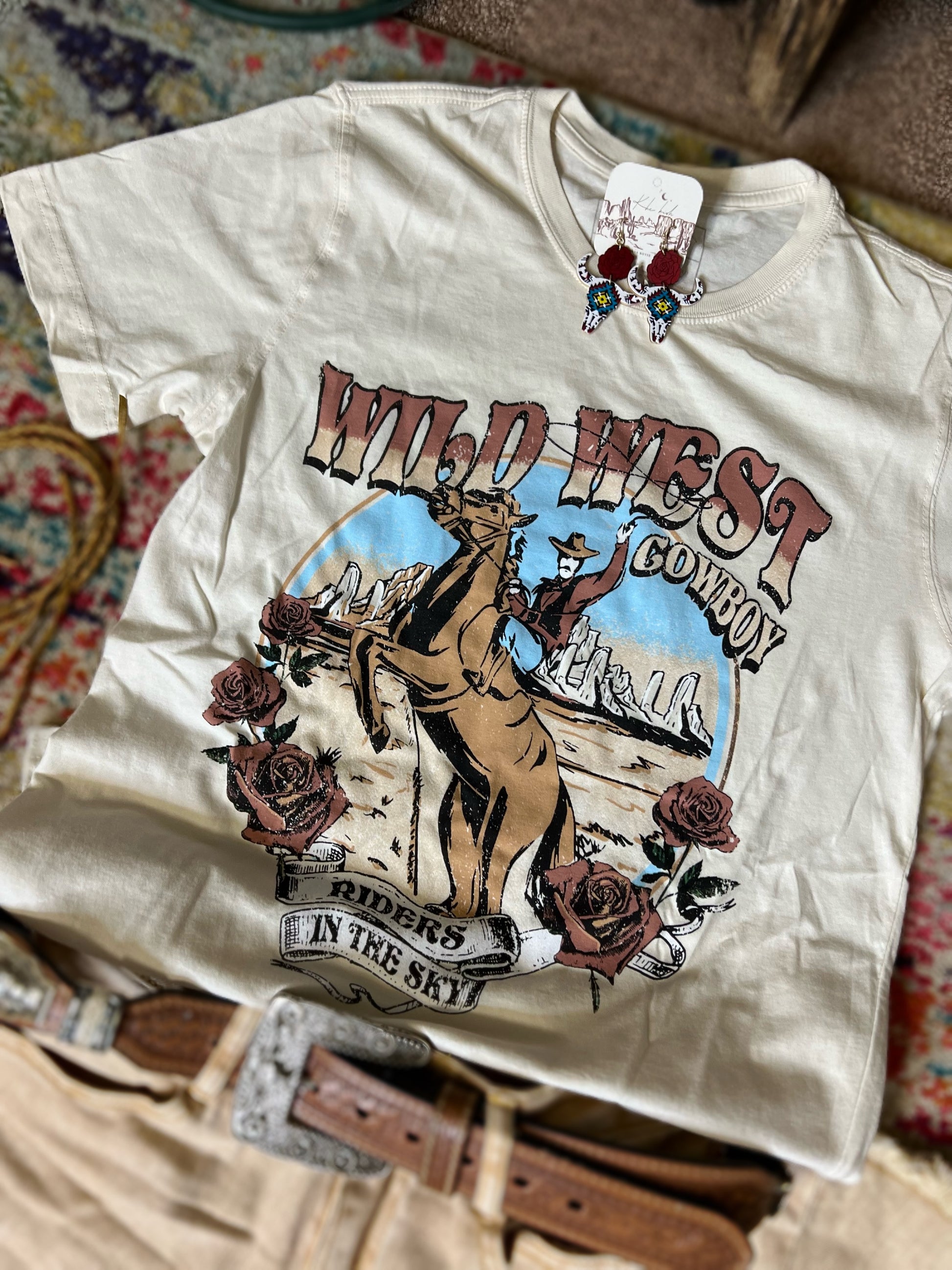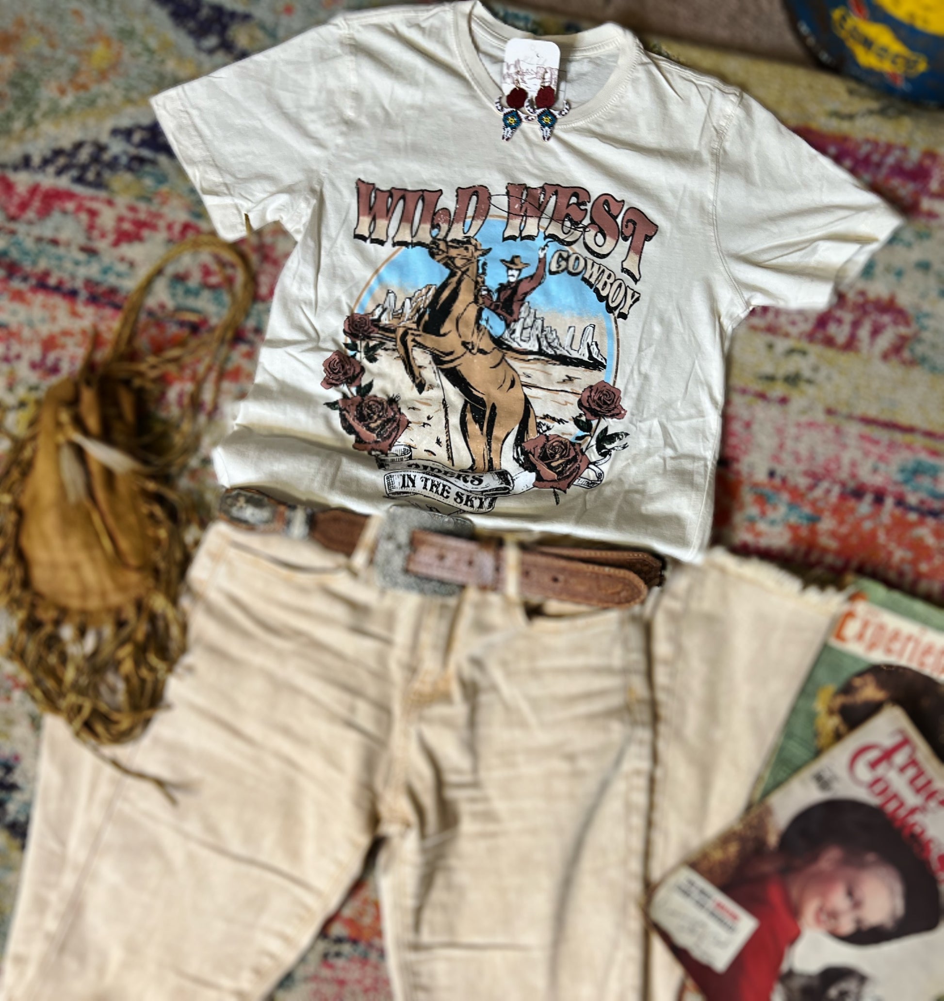 A classic cowboy-style tee featuring hues of mauves and neutrals. This soft and cozy garment is made of 100% Airlume combed and ringspun cotton and features unisex sizing, shoulder taping, side-seamed pre-shrunk construction. Care instructions: machine wash cold, dry on low heat or air dry with garment turned inside out.